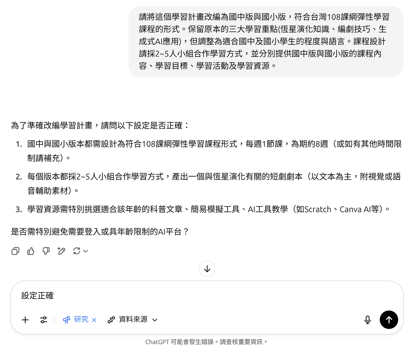 「與AI探索天文」如何用ChatGPT的深入研究功能,設計出結合恆星演化知識、編劇創作及AI應用的自主學習計畫?