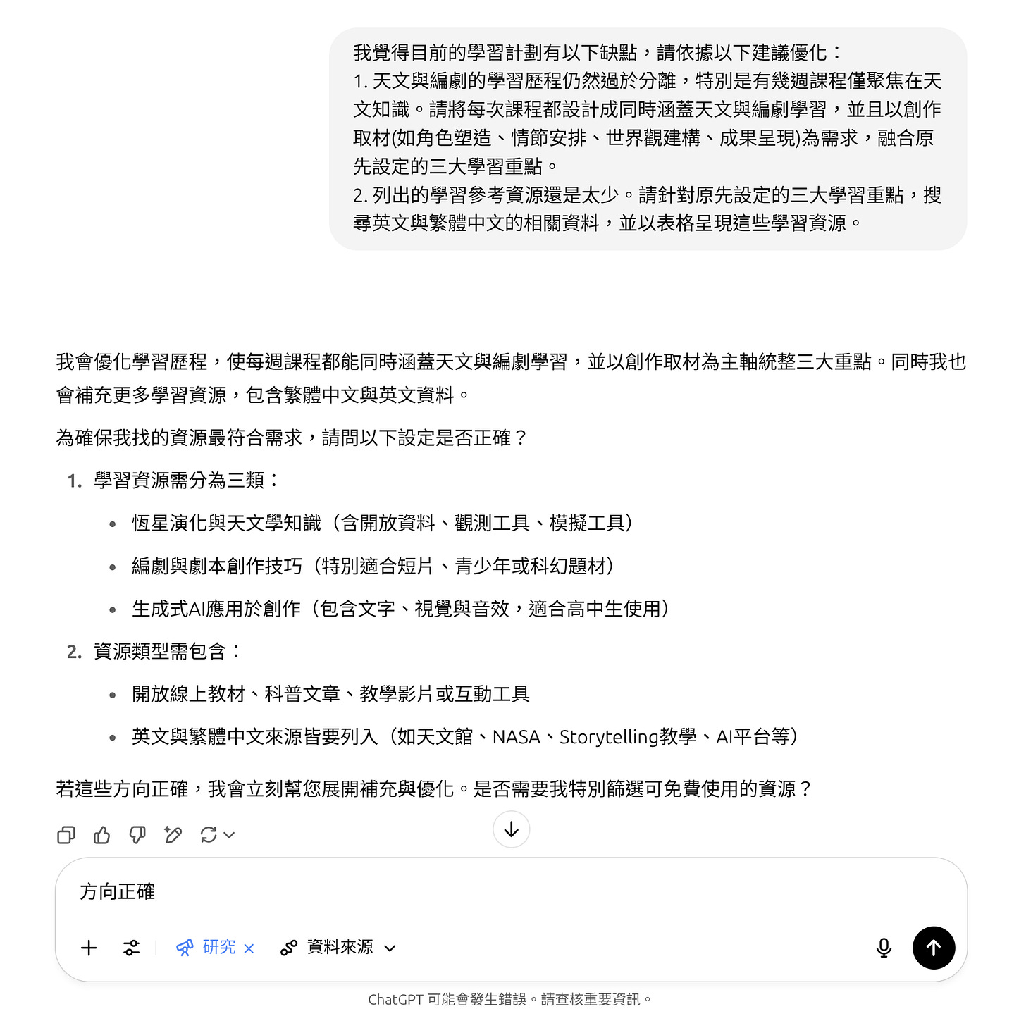你覺得這種混搭的學習方式很有趣,想藉由AI協助設計出跨領域的課程內容。闔上書,你向筆電視窗中的我問道:「我能利用AI工具,例如ChatGPT,搜尋彙整網路資訊,設計一個結合天文和編劇的跨領域學習計劃嗎?」