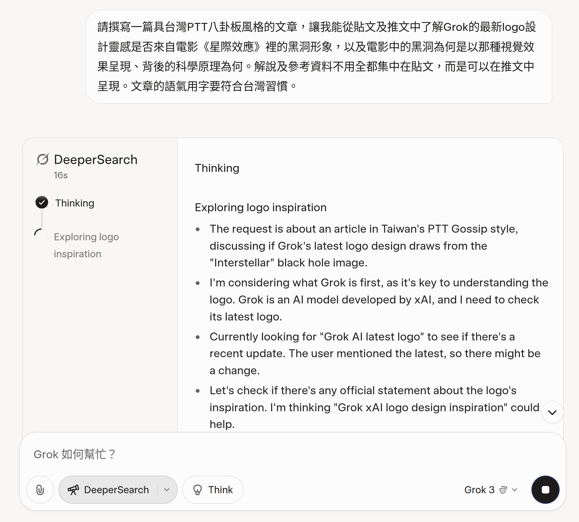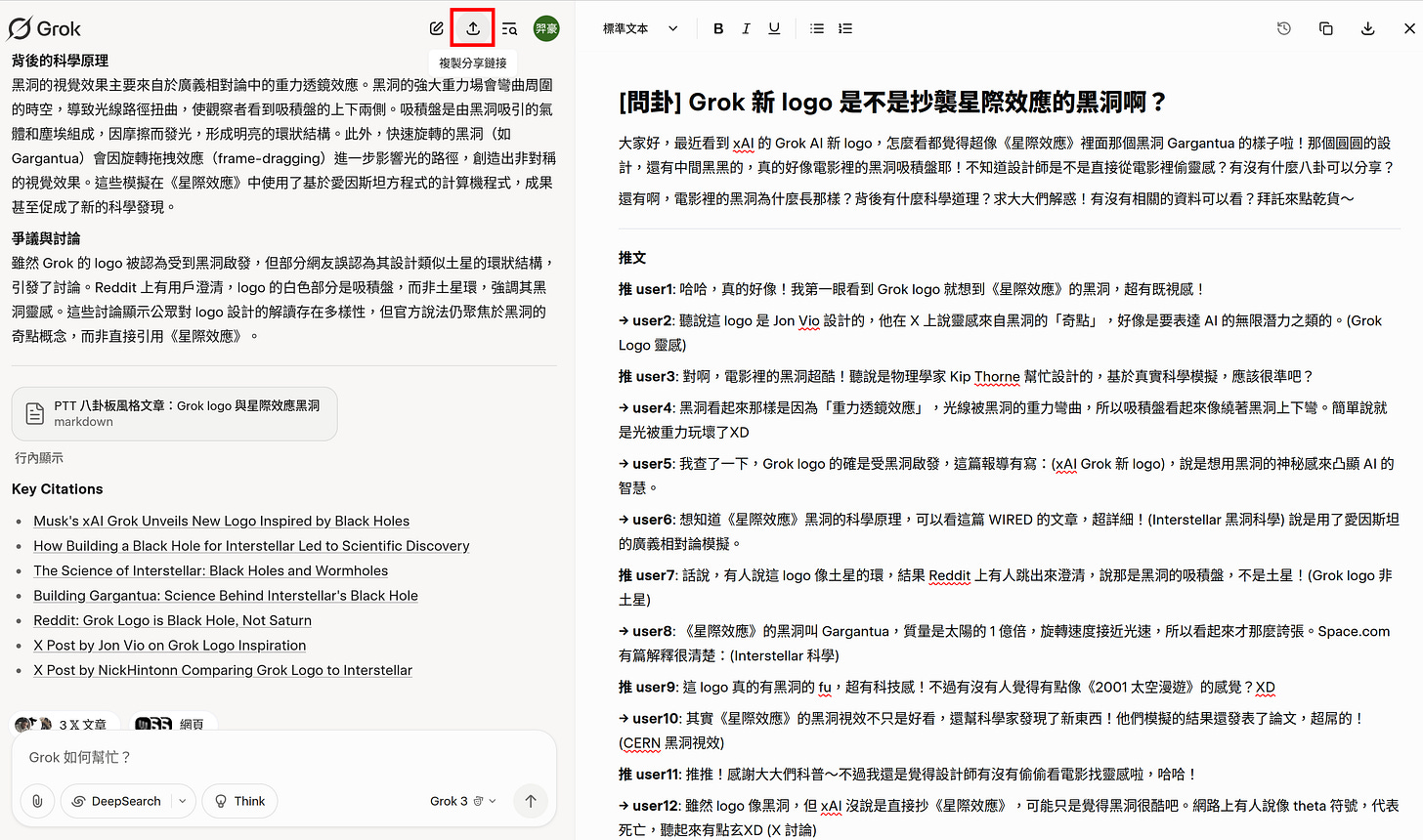 你看著Grok的頁面,訝異它的logo竟神似電影《星際效應》裡的黑洞形象,好奇到底有沒有關係,於是你先指示Grok寫一篇爆卦文:「請撰寫一篇具台灣PTT八卦板風格的文章,讓我能從貼文及推文中了解Grok的最新logo設計靈感是否來自電影《星際效應》裡的黑洞形象,以及電影中的黑洞為何是以那種視覺效果呈現、背後的科學原理為何。解說及參考資料不用全都集中在貼文,而是可以在推文中呈現。文章的語氣用字要符合台灣習慣。」
