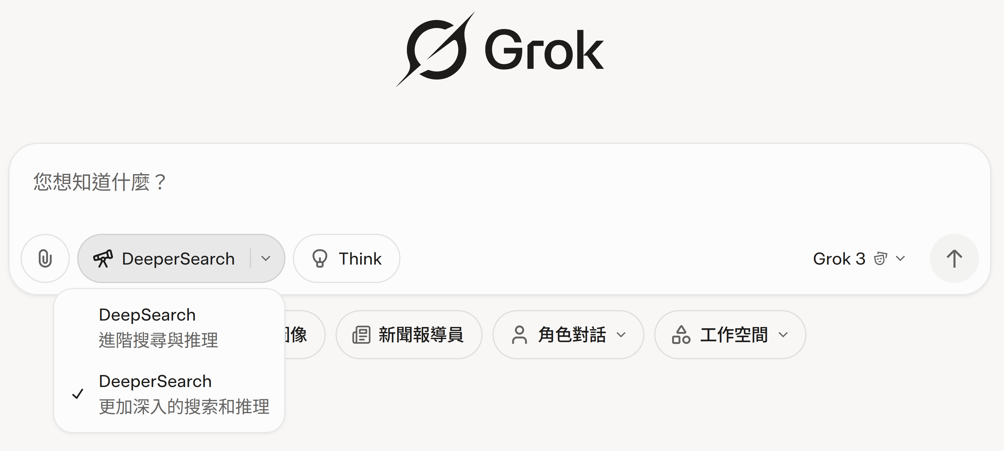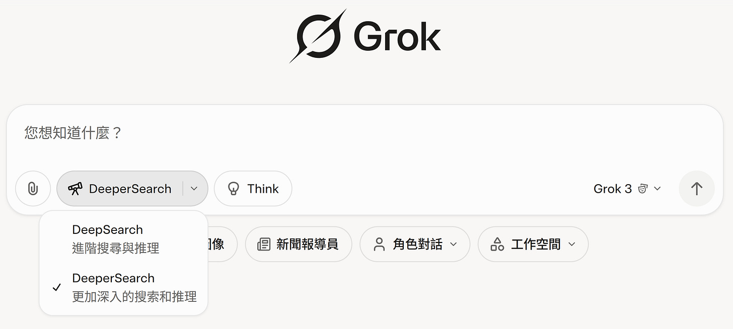 我回答:「黑洞嘛…Grok應該蠻適合的,它是X-Man伊隆·馬斯克的公司xAI開發的產品,也有『深入研究』功能。我已幫你開啟Grok網站並註冊登入,你只要在對話框下方的功能按鈕點擊『DeepSearch』或『DeeperSearch』,就可以輸入要搜尋的資訊及呈現的方式。」
