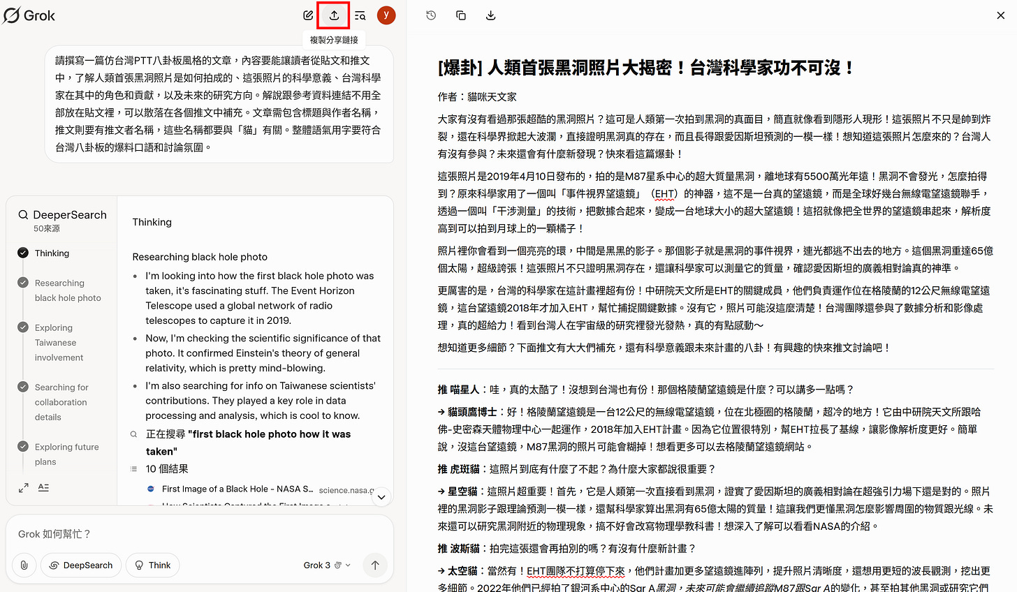 我在這篇文章中,分享如何用Grok的深入研究功能,將黑洞研究相關的天文知識,以有趣的方式重組呈現,例如PTT八卦板風格的文章。歡迎追蹤《與AI探索天文》的FB粉絲專頁、Threads、IG及X,並訂閱Substack電子報。我會分享如何運用各種AI工具,來探究你我好奇的天文主題、將它連結到生活及其他學科領域,並結合相關開放資料,打造有趣的天文應用程式與遊戲。我希望藉由這些分享,讓每個人都可以與AI創造出專屬自己的天文探索故事,拉近我們與星空的距離。