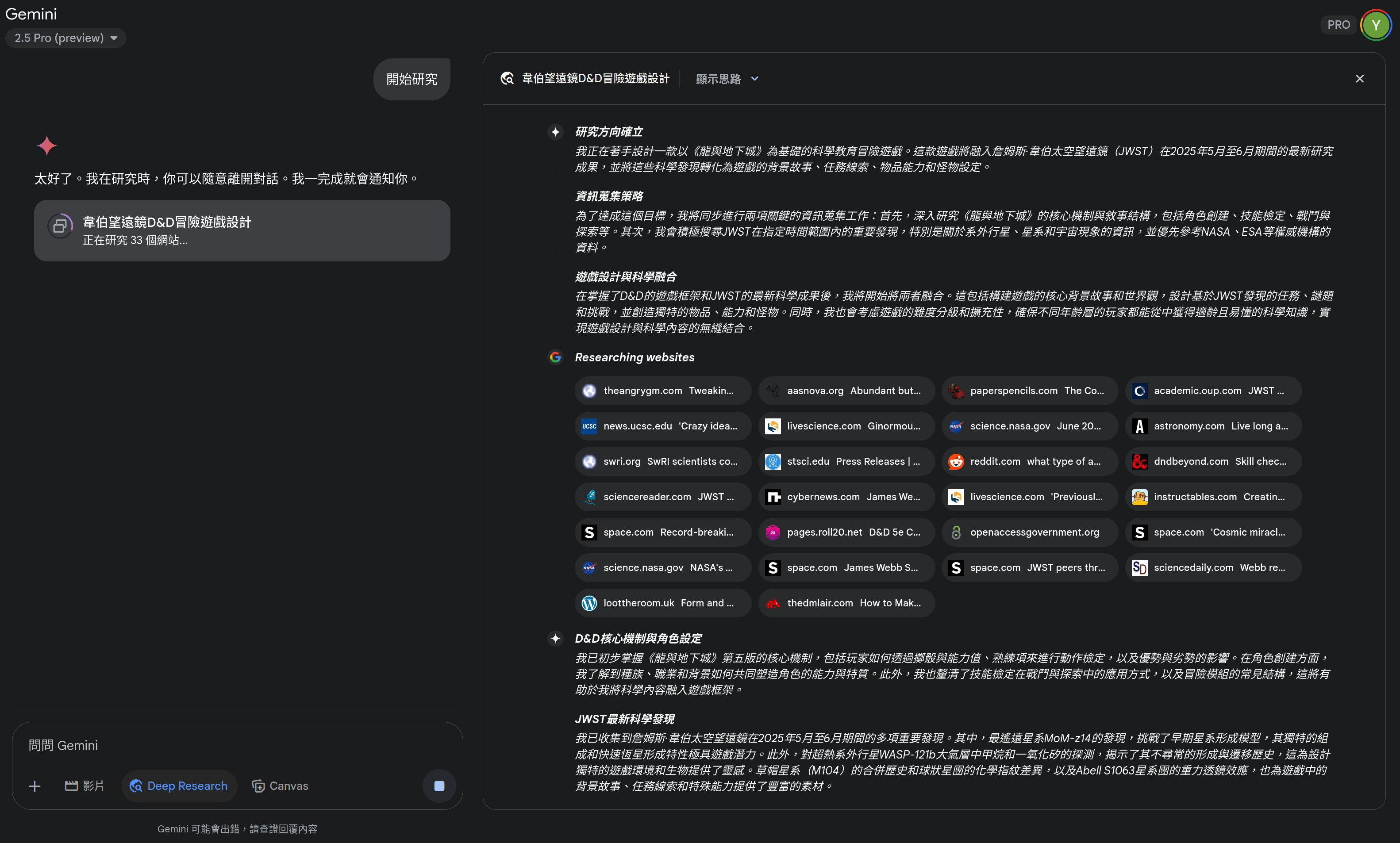 於是,你向筆電視窗中的我問道:「除了ChatGPT和Grok以外,還有沒有其他具備深入研究功能的AI工具,可以彙整網路上搜尋到的《龍與地下城》桌遊玩法規則及韋伯太空望遠鏡最新研究成果,並提供一個科學教育遊戲的設計文件?」