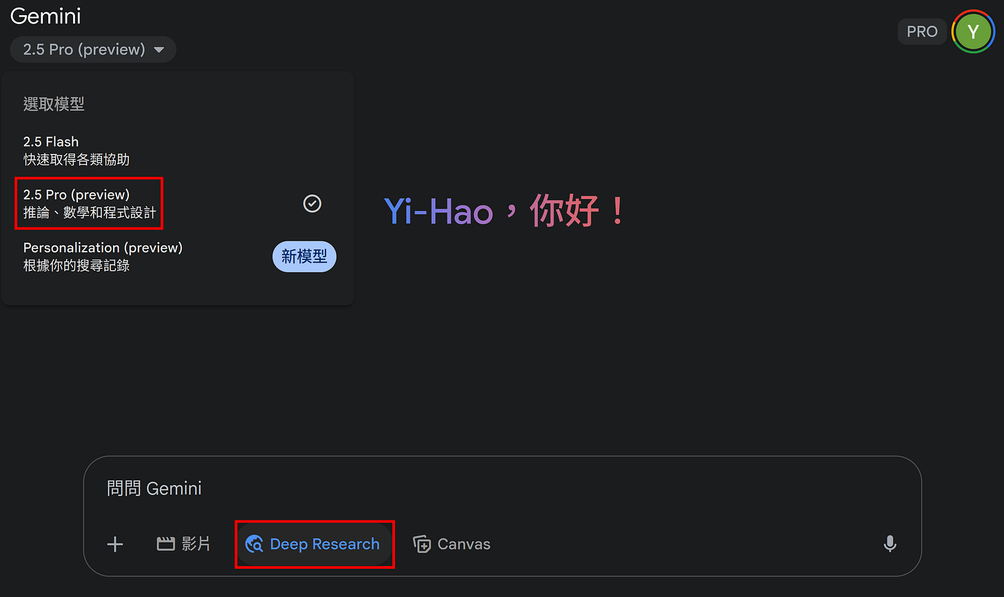 我回答:「你可以試試Google的AI Gemini。雖然它的前身Bard曾經錯答韋伯太空望遠鏡的新發現而上了新聞,不過它的搜尋及理解能力已有蠻大的進步,特別是深入研究功能。我已幫你開啟Gemini網站並用Google帳號註冊Pro版,目前它有一個月的免費試用期,可以使用到它最新的AI模型2.5 Pro來進行深入研究。你只要選擇模型並在對話框下方的功能按鈕點擊『Deep Research』,就可以輸入要請它搜尋的資訊及彙整成怎樣的文件。」