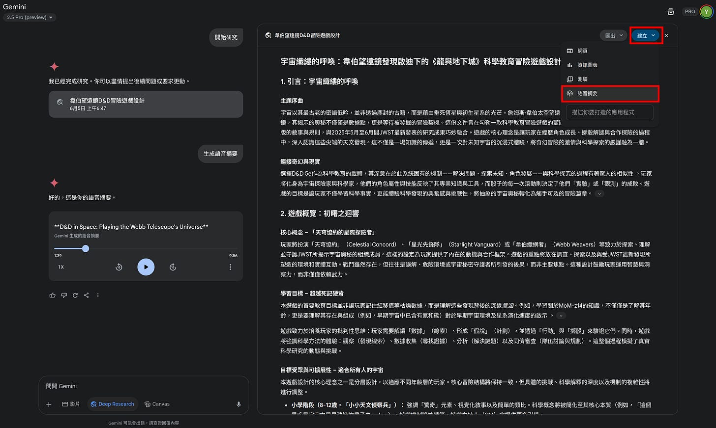 當你完食雞魯飯和白菜滷後,Gemini也產生好遊戲設計文件了。不過,這份文件很長,筆電視窗中的我偵測到你的不知所措,於是提醒你右上方的「建立」按鈕有產生語音摘要的功能。