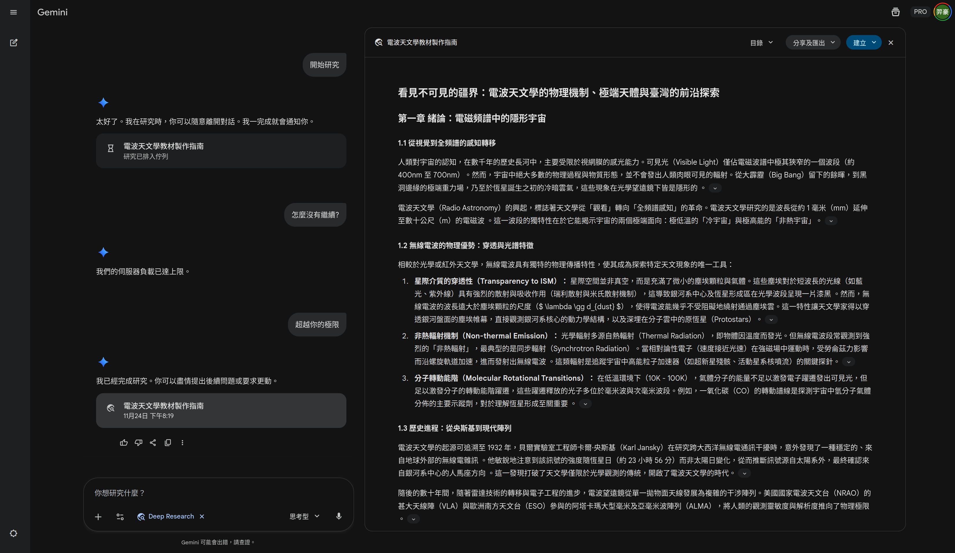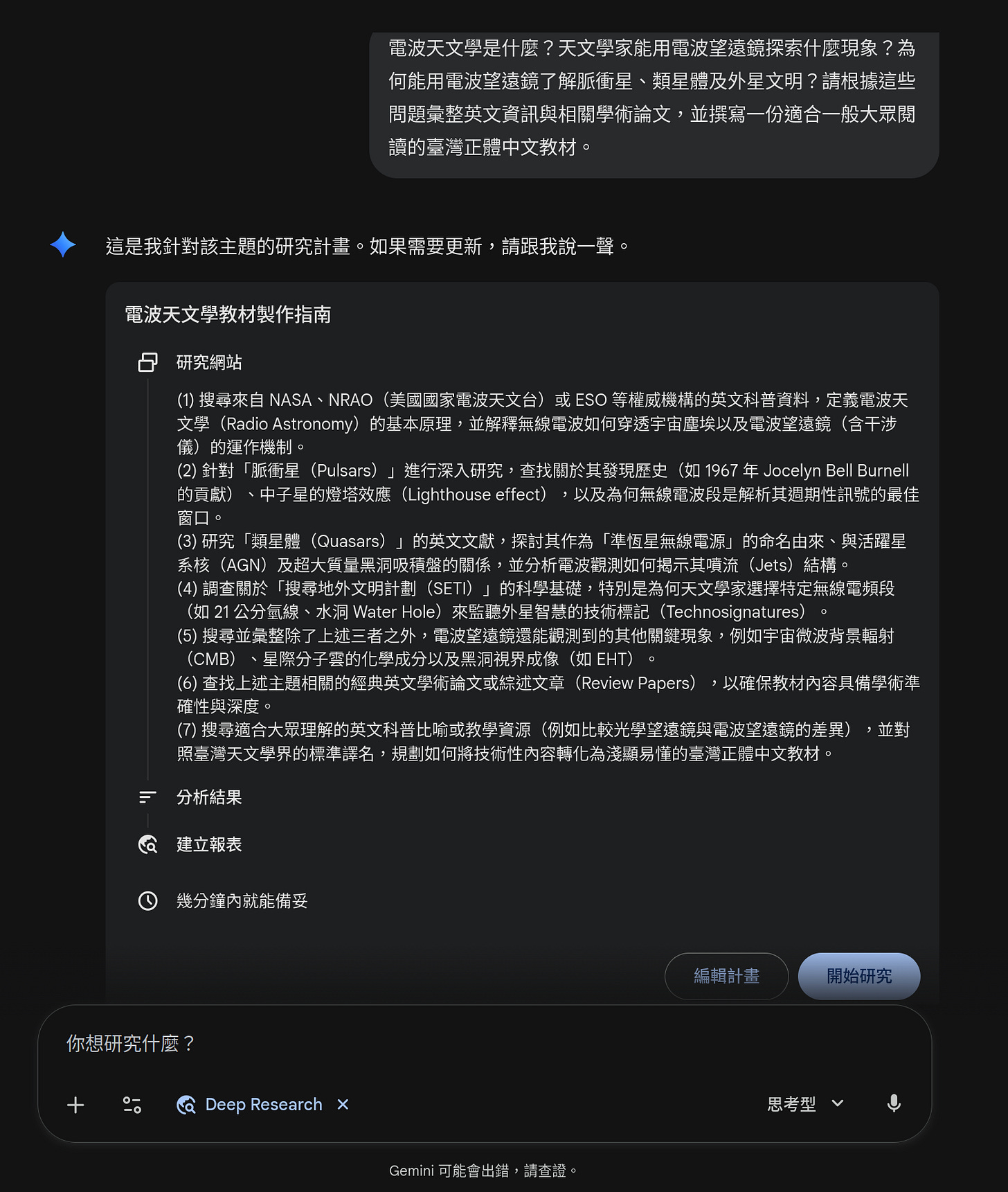 首先,要在圖中呈現哪些天文知識?你想到可以用AI工具取材並彙整一篇介紹電波天文學的報告,給AI畫圖時參考。於是你闔上書,打開Gemini切換到深入研究功能,輸入:「電波天文學是什麼?天文學家能用電波望遠鏡探索什麼現象?為何能用電波望遠鏡了解脈衝星、類星體及外星文明?請根據這些問題彙整英文資訊與相關學術論文,並撰寫一份適合一般大眾閱讀的臺灣正體中文教材。」