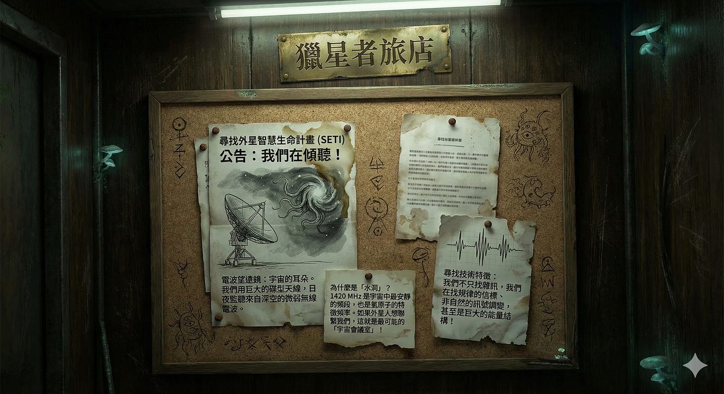 你前一陣子在《與AI探索天文》的IG上看到一張圖,是關於「如何藉由Claude Code用Python打造一個能認識行星科學的恐怖遊戲?」這篇文章,你喜歡那種能傳達天文知識的恐怖畫面,於是輸入下一張圖的產生指令:「畫面是『獵星者旅店』的電梯內,瀰漫著克蘇魯神話的恐怖氛圍。鏡頭聚焦在牆上的佈告欄,張貼著許多關於SETI計畫用電波望遠鏡尋找外星生命的公告。公告中的天文知識淺顯易懂且要基於pdf的內容,文字用台灣繁體中文。」