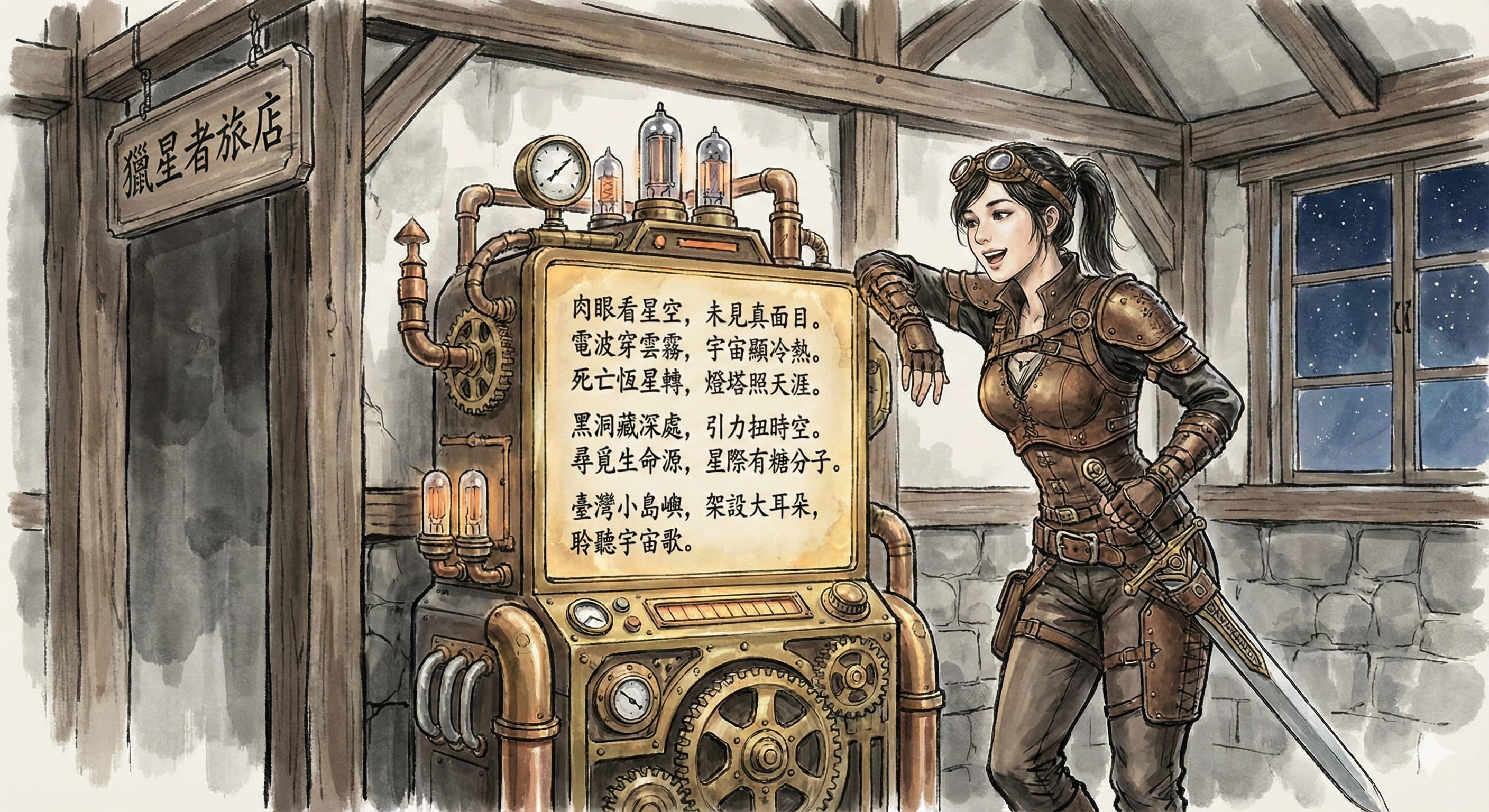 隨著指令執行,出現一張充滿水墨韻味的圖,木造的旅店角落掛著「獵星者旅店」的招牌,那台巨大的蒸汽龐克點唱機正運轉著,金屬齒輪咬合與發光的真空管交織出復古科幻感,螢幕上清晰呈現著關於電波天文學的詩句,內容從肉眼未見的星空、穿透雲霧的電波、旋轉的脈衝星燈塔,一路講到黑洞與星際糖分子,最後更提及台灣小島嶼協助架設的「大耳朵」望遠鏡。一名身著皮甲、配戴護目鏡的女劍客瀟灑地倚靠在點唱機旁,一手扶著佩劍,神情愉悅地看著螢幕,隨著旋律輕輕哼唱著這首將深奧天文知識化為通俗易懂的宇宙歌謠。