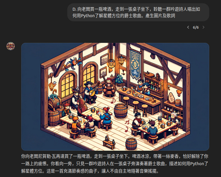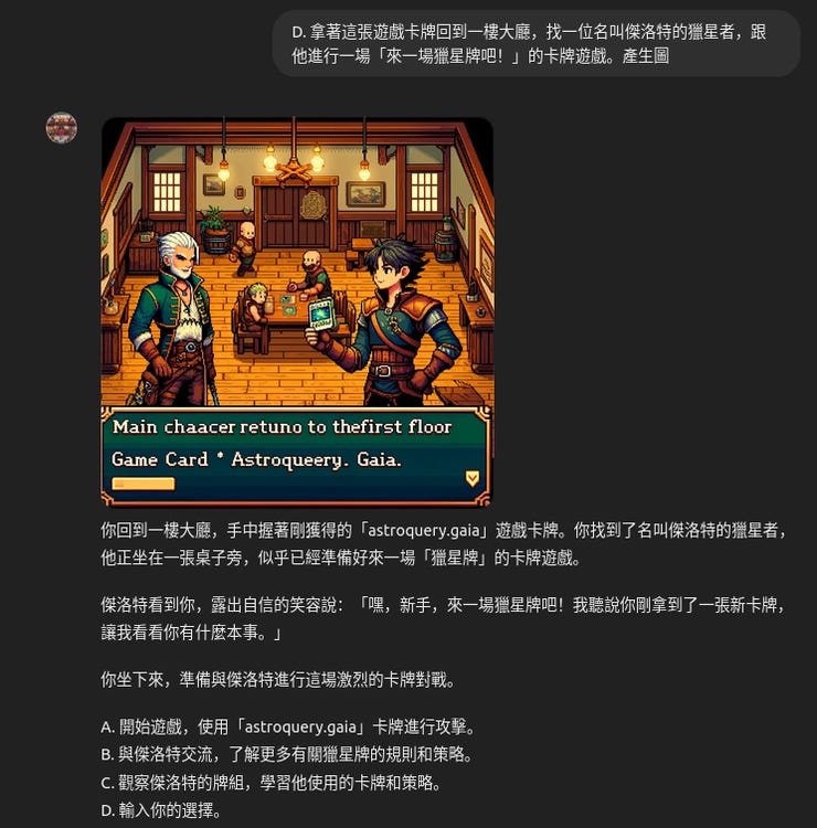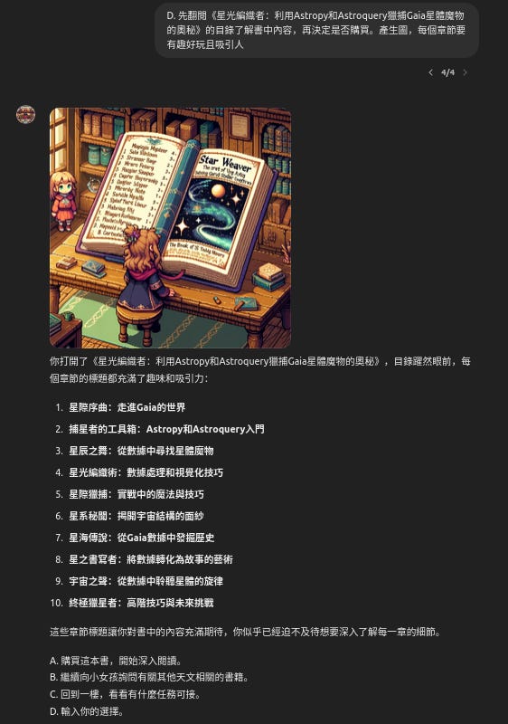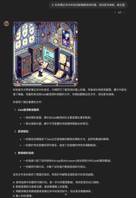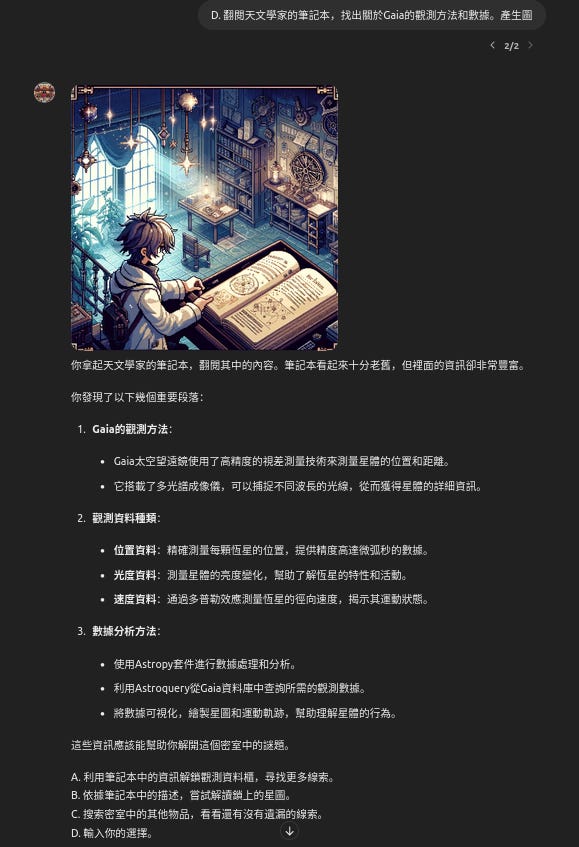以下是我在這兩場演講中示範遊玩《獵星者旅店》的截圖。我未來也會持續創造讓天文更開放、拉近群眾與星空的距離的生成式AI產品。