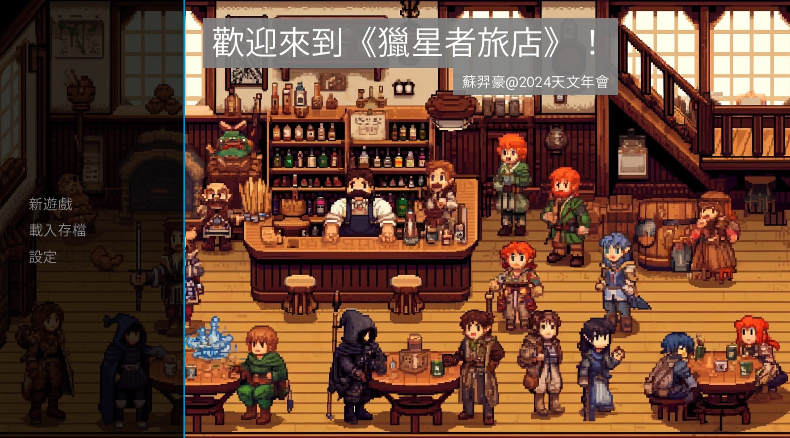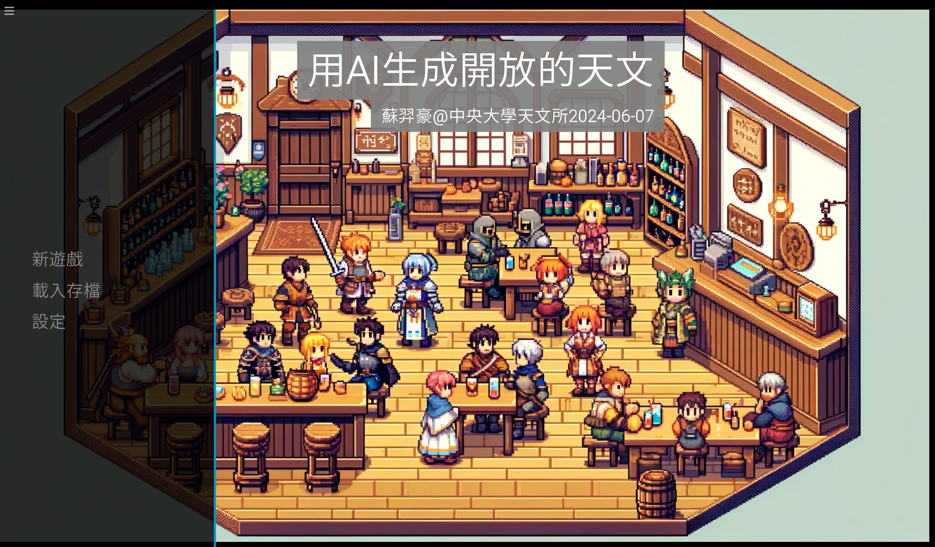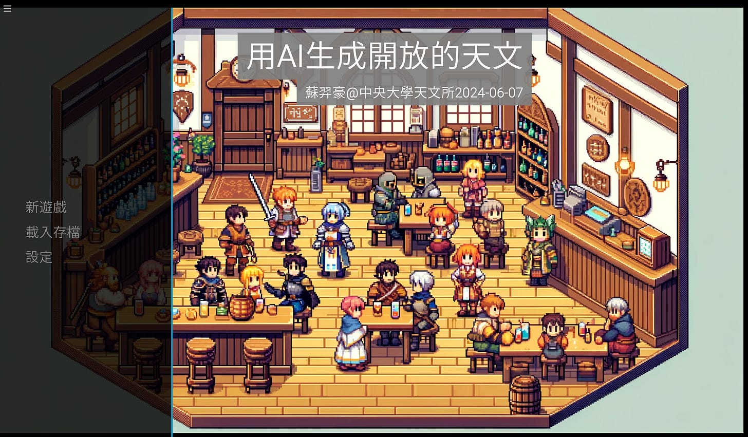 前兩週,我接連到天文年會及中央大學天文所演講,分享示範如何遊玩《獵星者旅店》。這是我第一次嘗試用Python的視覺小說遊戲引擎Ren'Py來製作演講"簡報"XD